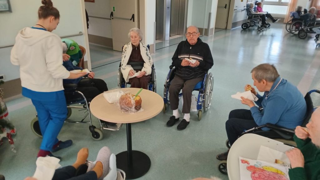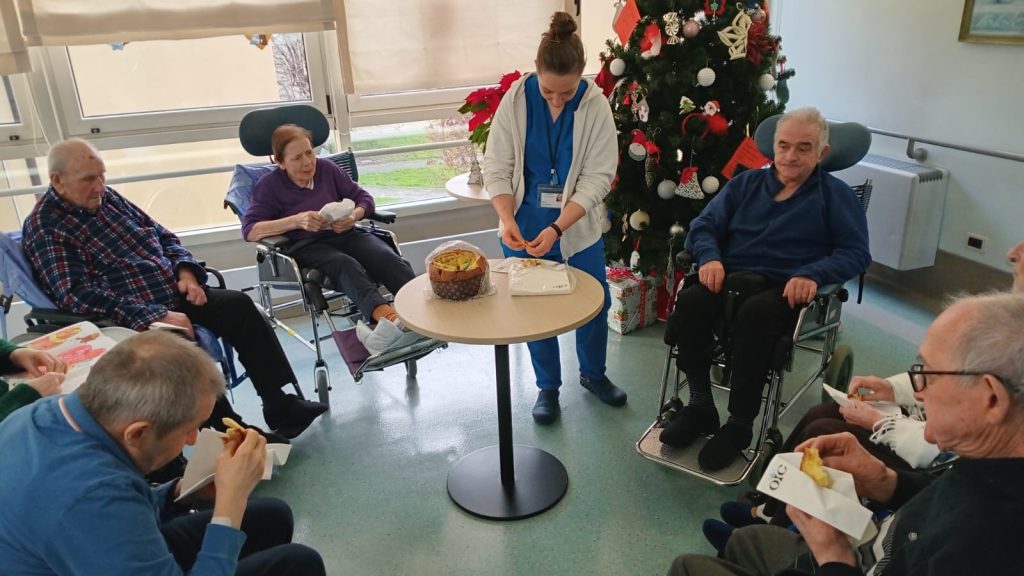 Succede anche questo nelle nostre residenze, un momento conviviale nato spontaneamente su proposta di un ospite del Centro. Il Signor Lino Campesan storico barbiere di Carmignano di Brenta ha voluto condividere un panettone, da lui offerto, con alcuni amici del suo piano e quando ha manifestato questo desiderio è stato subito accolto. Si è così organizzato un tavolo con alcuni amici e con l’aiuto della logopedista e di una educatrice si è dato vita a un momento conviviale molto apprezzato dai presenti. Lino era molto contento e soddisfatto di poter così dare anche lui un contributo significativo alle feste e poter ancora una volta fare le veci del padrone di casa.