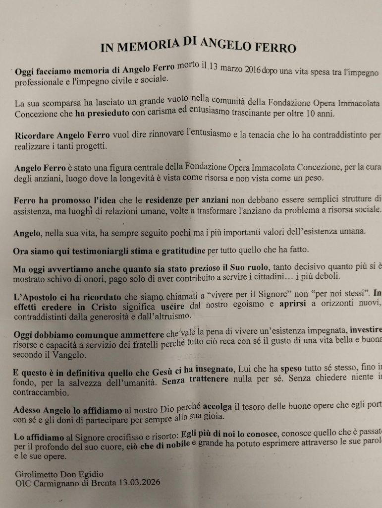 Il 13 Marzo 2026 è stata celebrata nella Cappella della Residenza G. Botton di Carmignano di Brenta una Santa Messa a suffragio del prof. Angelo Ferro deceduto all’età di 78 anni nella notte tra sabato 12 e domenica 13 Marzo 2016. Ricorrono dunque 10 anni dalla scomparsa dell’amatissimo prof. Ferro che è stato in vita testimone di virtù e diffusore di speranza con l’umiltà di di colui che riconduce sempre tutto non a se stesso ma a Dio e alla Vergine Maria. La Santa Messa è stata celebrata dal cappellano della residenza don Egidio Girolimetto in presenza di numerosi ospiti, alcuni lavoratori e familiari, dei volontari V.A.D.A. e del direttore del Centro Servizi.